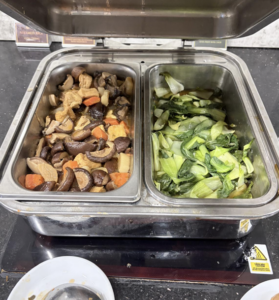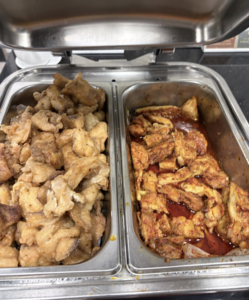 食事内容も多彩で、インディアンテイストのカレー、中華風メニュー、マンゴーケーキ、唐揚げやフライドフィッシュ、野菜・サラダ類まで幅広く提供されていました。