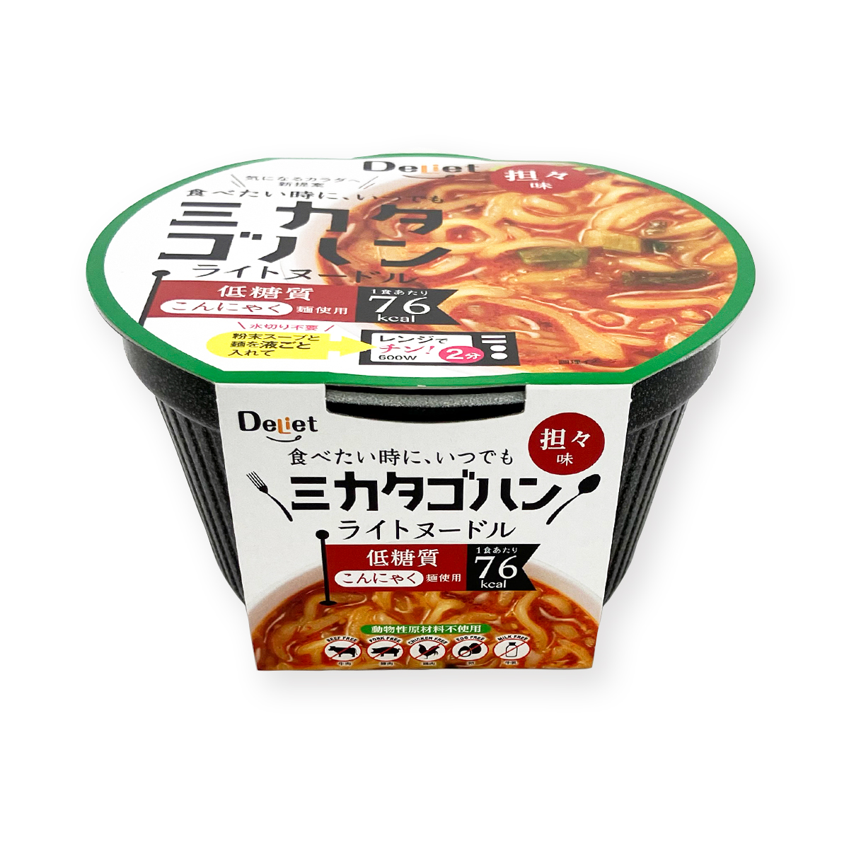 こんにゃく臭さが気にならず、もちっとした弾力とつるっと滑らかな食感の麺に動物性原材料不使用で、味噌にこだわったコクのある旨みと辛さを効かせた担々味です。