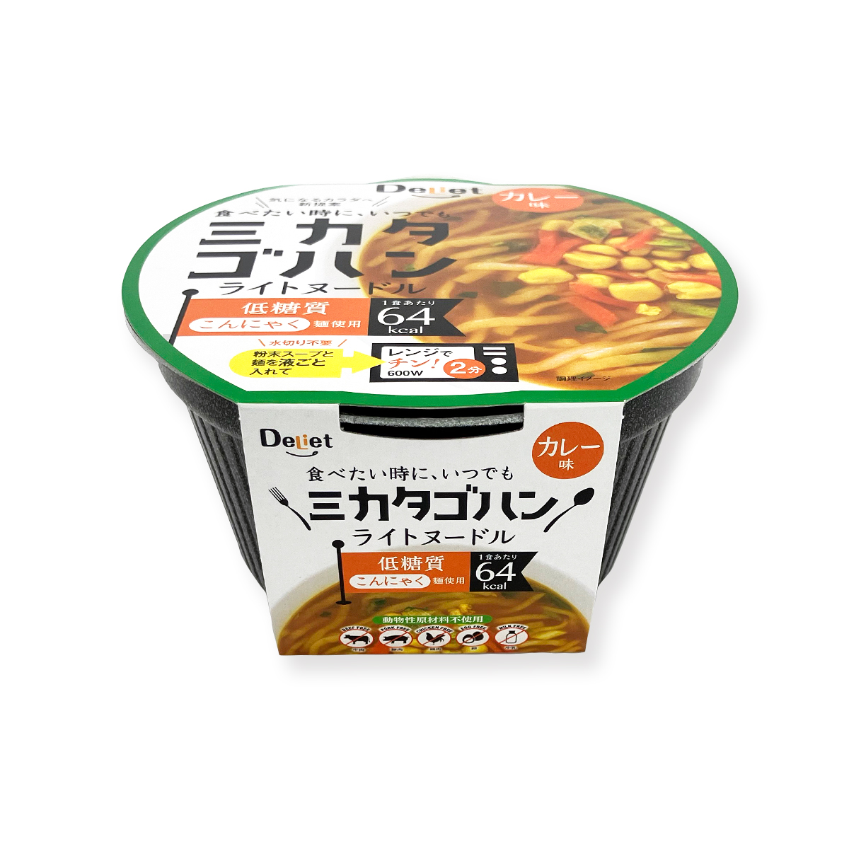 - 【こんにゃく麺】豆乳(国内製造)、こんにゃく粉(国産)、食塩、米粉、大豆発酵調味料(大豆粉、米粉)、食物繊維(オート麦由来)、かぼちゃ粉末/水酸化カルシウム(こんにゃく用凝固剤)、(一部に大豆を含む 【スープ】食塩(国内製造)、カレー粉、小麦粉、人参、コーン、オニオンエキスパウダー、とりそぼろ(鶏肉、大豆たん白、卵白、デキストリン、チキンオイル、その他)、トマトパウダー、ねぎ、チキンエキスパウダー、ポークエキスパウダー、酵母エキスパウダー、マッシュポテト、乳糖、香辛料、ガーリックパウダー、粉末しょうゆ、人参エキスパウダー、鰹節粉末/増粘剤(加工デンプン、キサンタン)、調味料(アミノ酸等)、pH調整剤、カラメル色素、セルロース、微粒二酸化ケイ素、リン酸Ca、加工デンプン、甘味料(スクラロース)、酸化防止剤(ローズマリー抽出物)、(一部に小麦・乳成分・卵・鶏肉・豚肉・大豆を含む)
