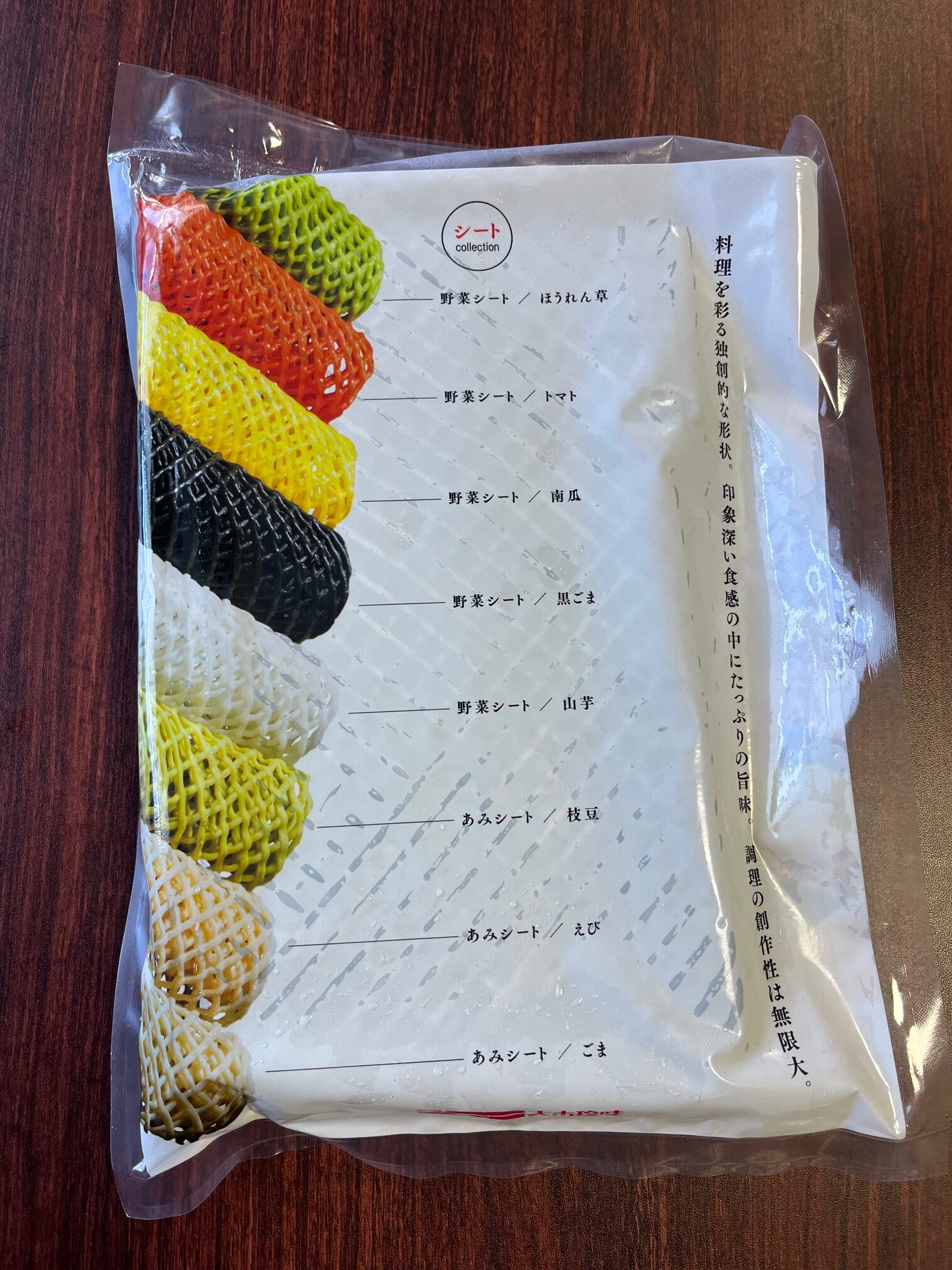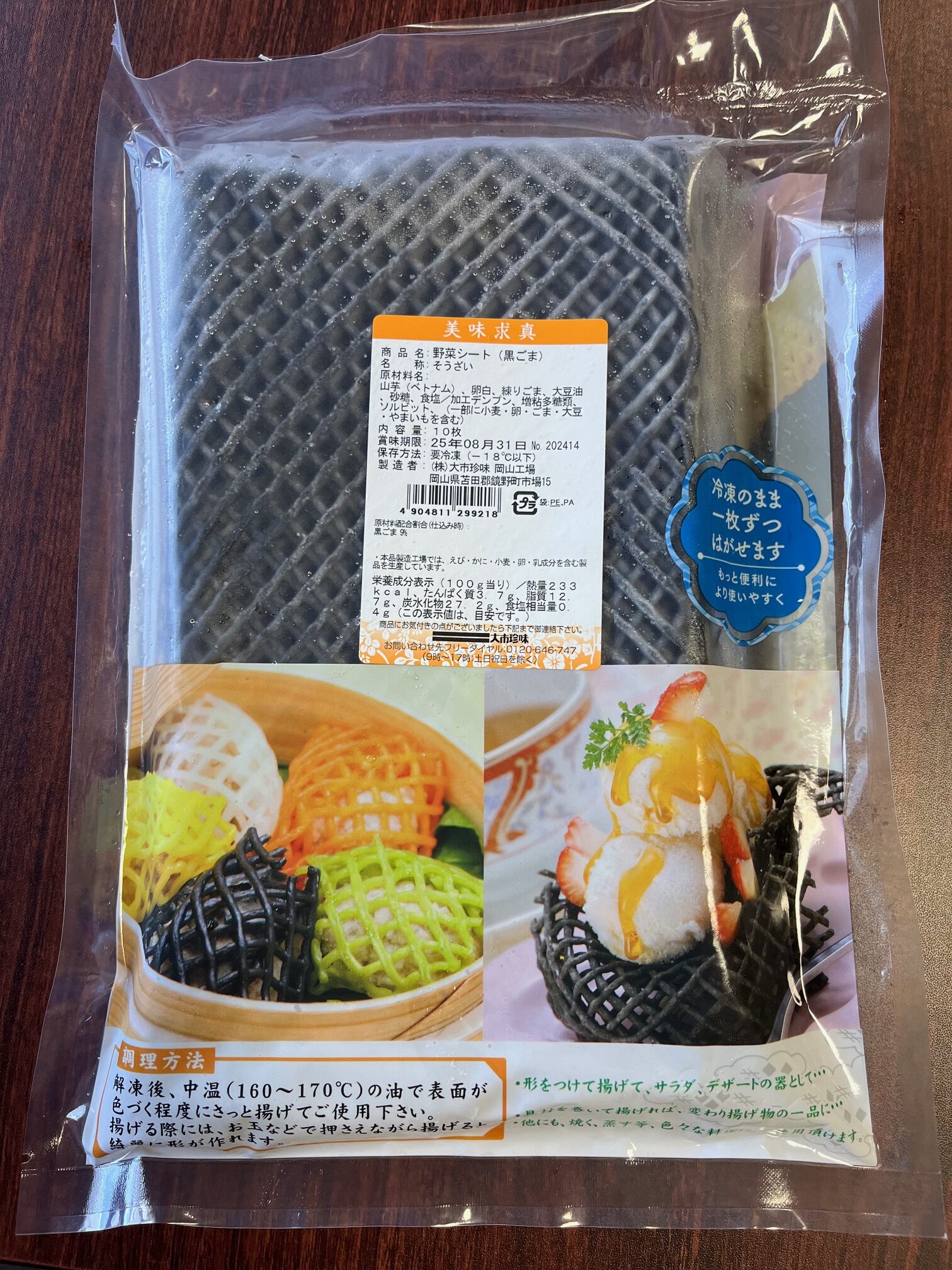 冷えてもサクッとした食感が味わえる、黒ごまの色目と味が特徴の網目状のシートです。