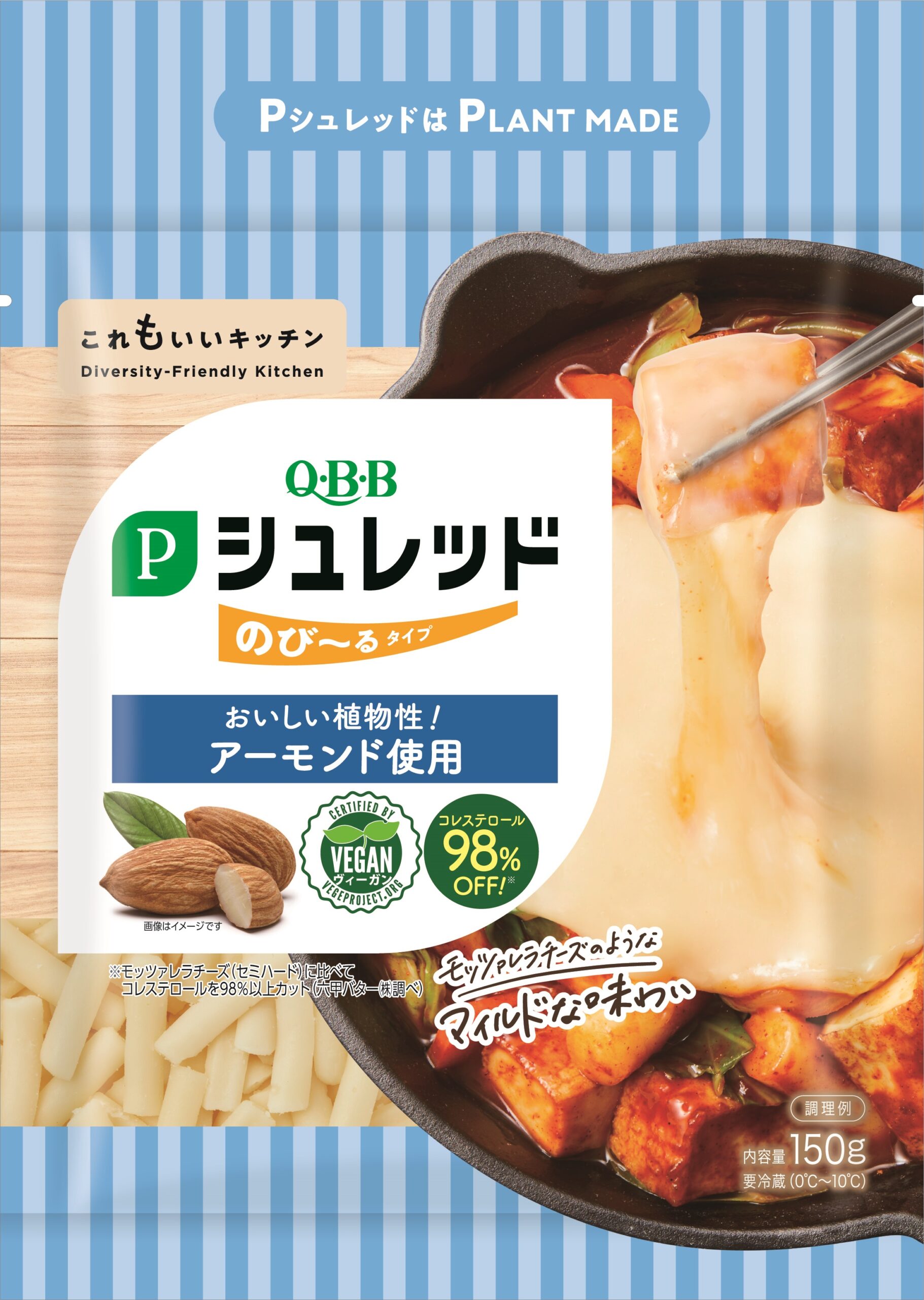 家庭用商品である「Pシュレッド」シリーズから、モッツアレラチーズ風味の「Pシュレッド のびーるタイプ」を展開。